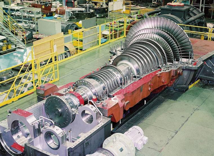 A rotary mechanical device that converts thermal energy from steam into mechanical energy, commonly used for electricity generation and industrial power applications.